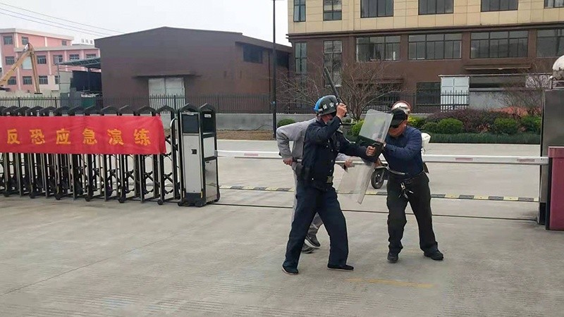 下午15:00,演練準(zhǔn)時開始。安環(huán)部陳雷現(xiàn)場講解了防暴工具的正確使用方法及應(yīng)急處置方案。然后一名安保人員扮演“可疑人員”,其余安保人員按照應(yīng)急處置方案,按響警鈴,迅速穿戴防暴工具,大家齊心協(xié)力,制服“可疑人員”。