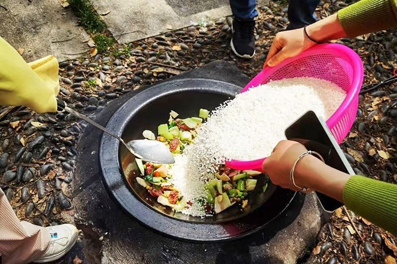 爬山結束,在山腳下的集合地,負責后勤的同事們早已為大家準備好了香噴噴熱乎乎的野米飯以及各種水果、零食,貼心滿滿。