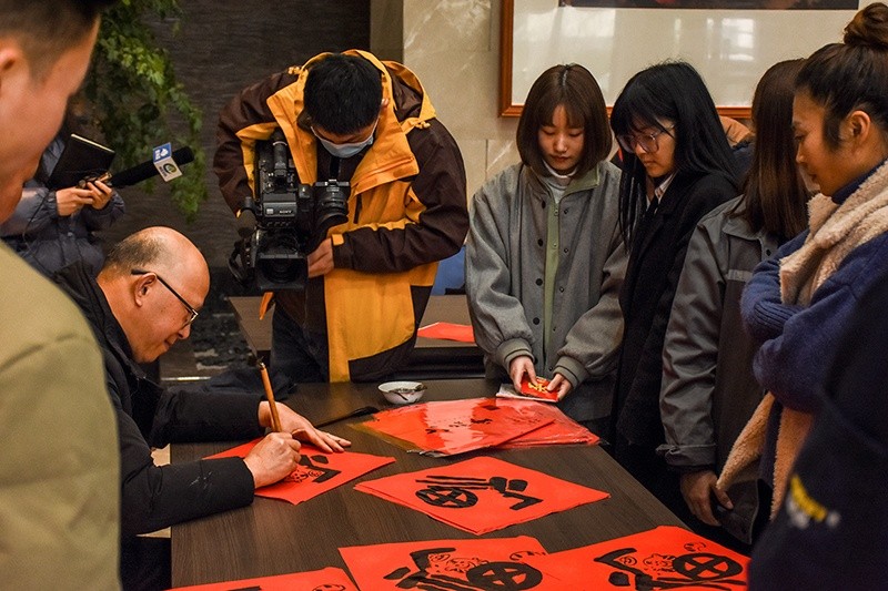 現(xiàn)場充滿歡聲笑語、墨香四溢,充滿了喜慶的節(jié)日氣氛。隨著倒墨、鋪紙、潤筆等準(zhǔn)備工作就緒,書法家們飽蘸濃墨盡情揮毫,一停一頓、一起一落間,一幅幅充滿承載美好祝愿的春聯(lián)字在筆下熠熠生輝。一副副墨寶飄香的春聯(lián)、一張張飽含真情的“?!弊?、一句句吉祥喜慶的話語展現(xiàn)眼前,無不表達(dá)著大家對新年的美好憧憬,寄托著對新年的殷殷期盼。