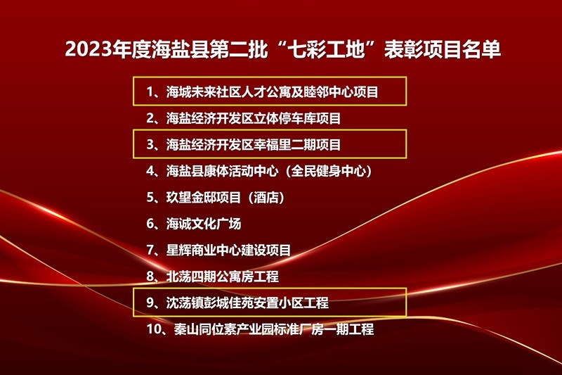 會(huì)議表彰了海鹽縣2023年度第二批“七彩工地”示范項(xiàng)目,中達(dá)集團(tuán)旗下子公司中達(dá)建設(shè)海城未來社區(qū)人才公寓及睦鄰中心項(xiàng)目、幸福里二期項(xiàng)目、彭城佳苑項(xiàng)目榜上有名。