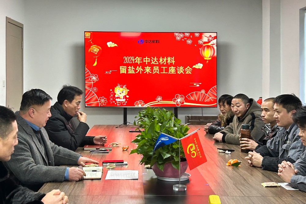 春節(jié)前,朱主席便來到中達(dá)材料參加了留鹽外來員工座談會,調(diào)研了解公司的生產(chǎn)情況與留鹽外來員工的工作、生活狀況,感謝他們?yōu)橹羞_(dá)做出的貢獻(xiàn),向他們及其家人致以誠摯問候和佳節(jié)祝福,并送上了春節(jié)慰問品。朱主席叮囑中達(dá)材料工會要為留鹽外來員工提供便利,做好節(jié)日期間的防護(hù)措施,讓廣大留鹽外來員工感受到家的溫暖。
